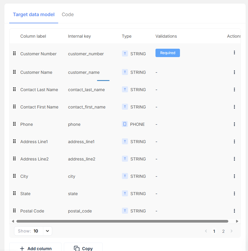 Save the above data into a CSV file and drop it into the TDM dropdown. This will automatically identify the header and map it to the target data model. You can define the Target data model in the UI or in the code. Additionally, you can apply required, unique, and regex validations, as well as specify the column type (e.g., float, int, date, currency, etc.). Many of these data types already have certain validation logic, reducing our data cleaning effort.